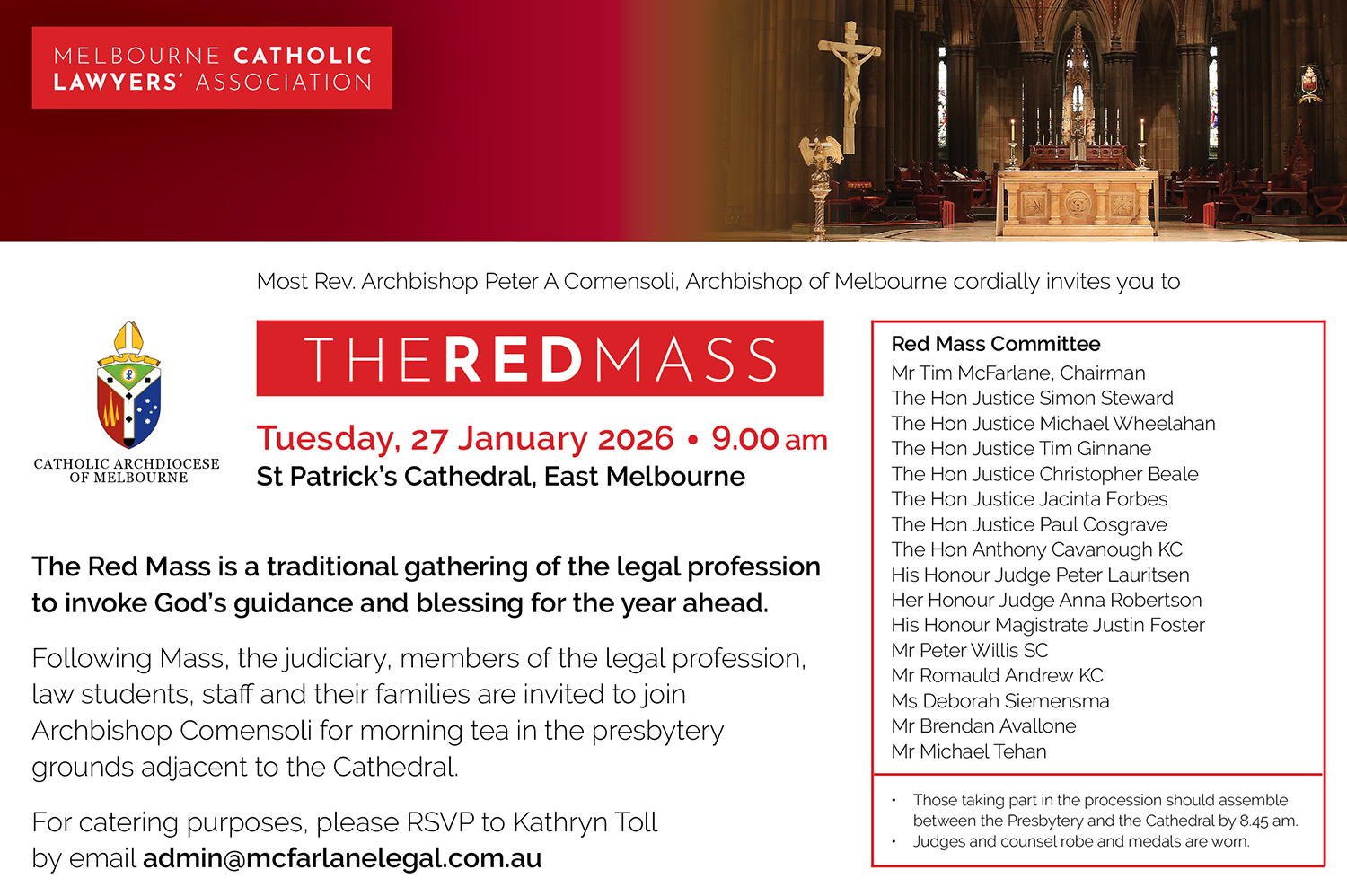 - The Red Mass will be celebrated on Tuesday, 27 January 2026 at St Patrick’s Cathedral, Melbourne.